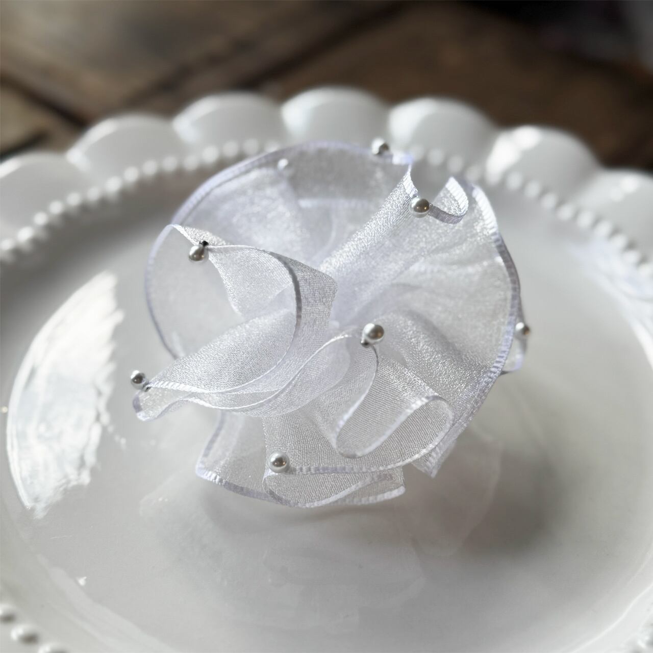 ・オーガンジー特有の透け感・光沢の出方、パールの位置は一つひとつ異なります。