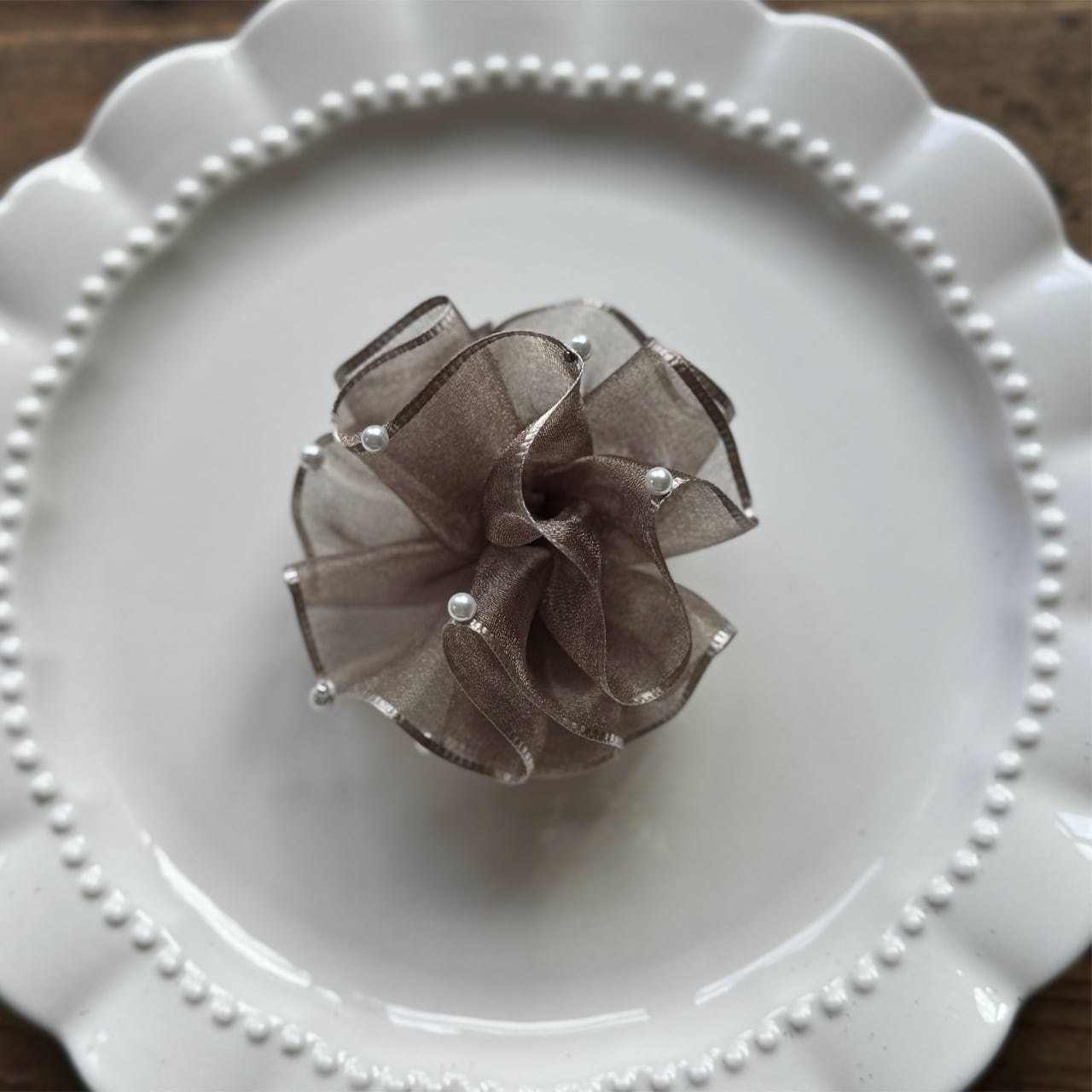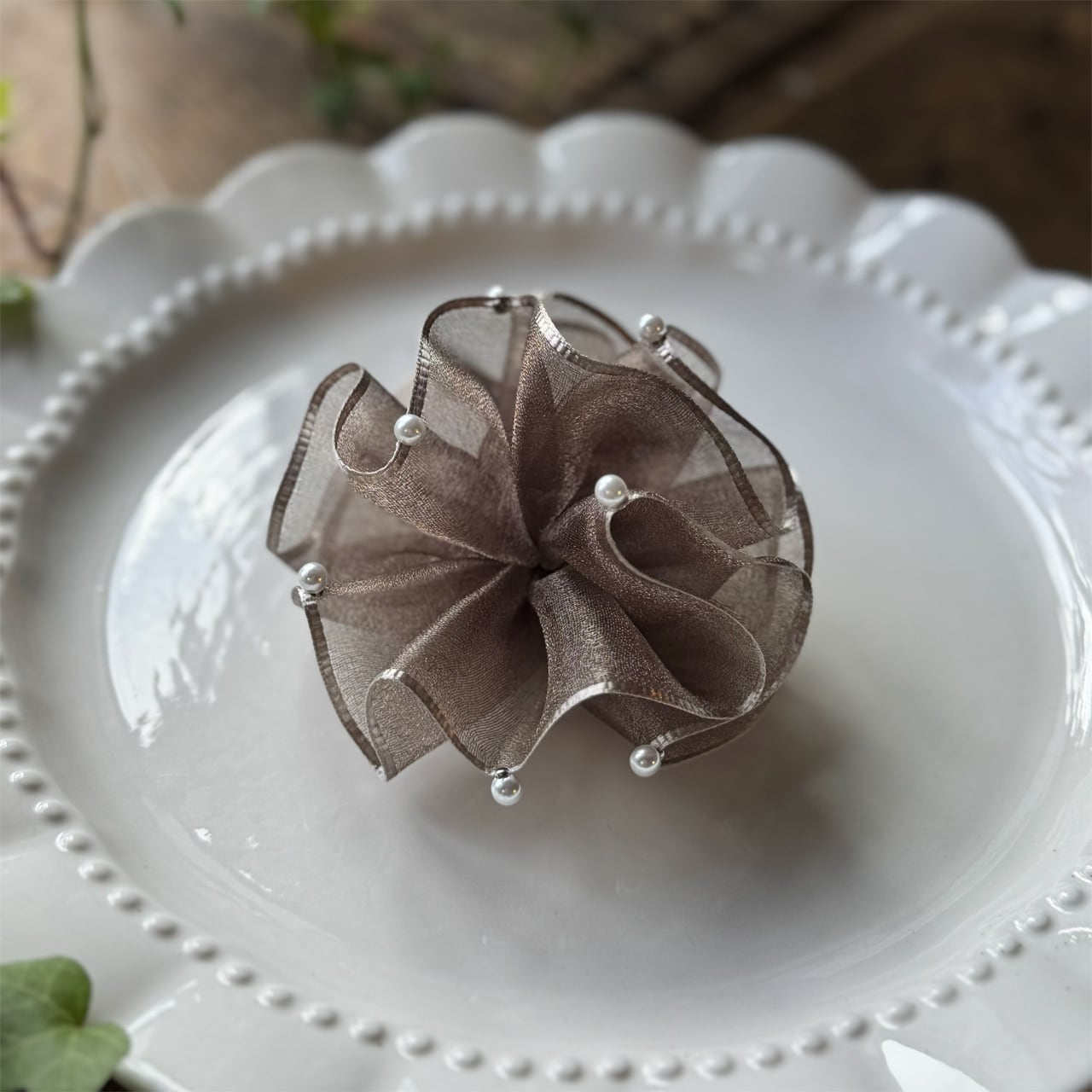 ・オーガンジー特有の透け感・光沢の出方、パールの位置は一つひとつ異なります。