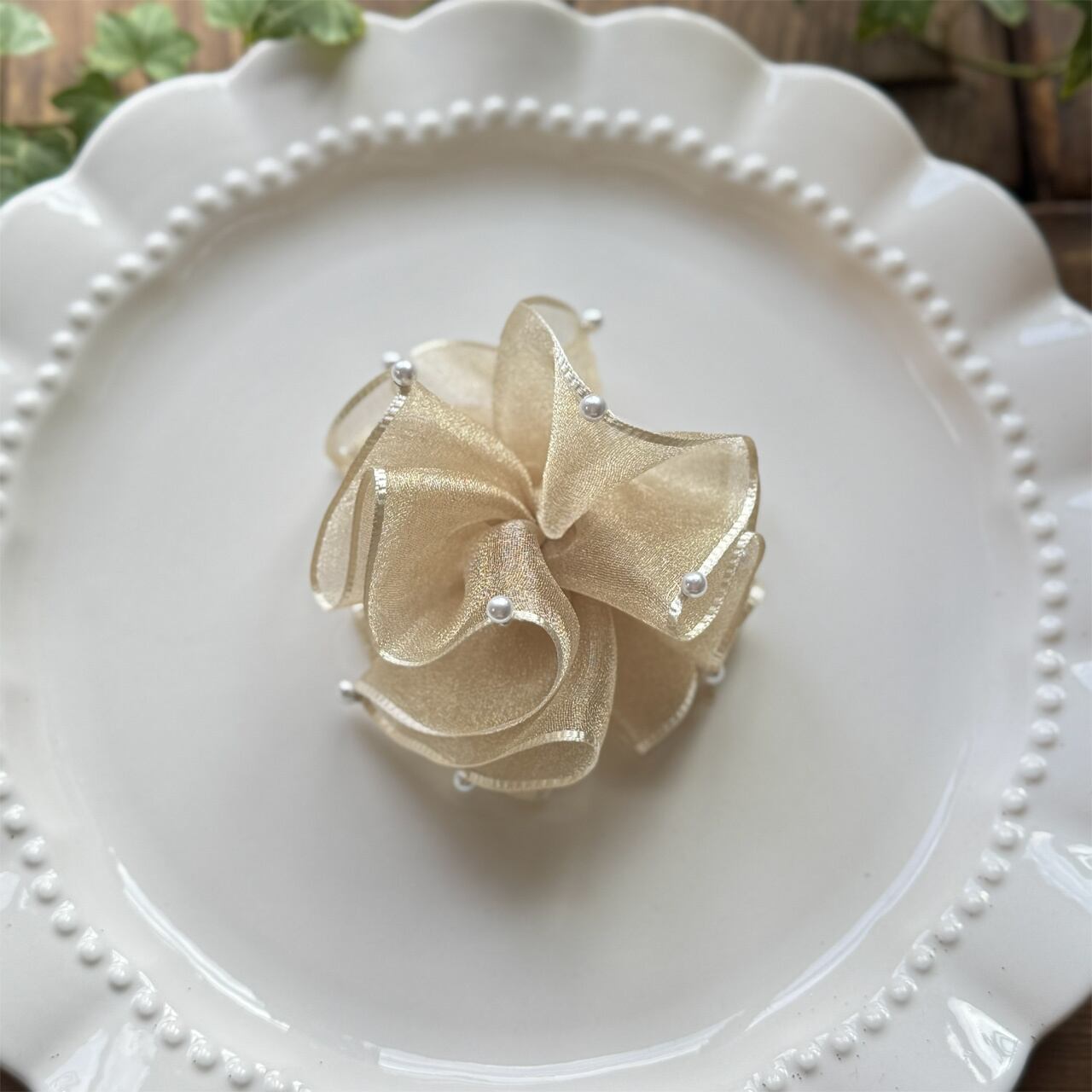 【ポニーフック】ふんわりパフィ Champagne Glow(ゴールドベージュ) — ぽんぽんオーガンジーの上品リボン