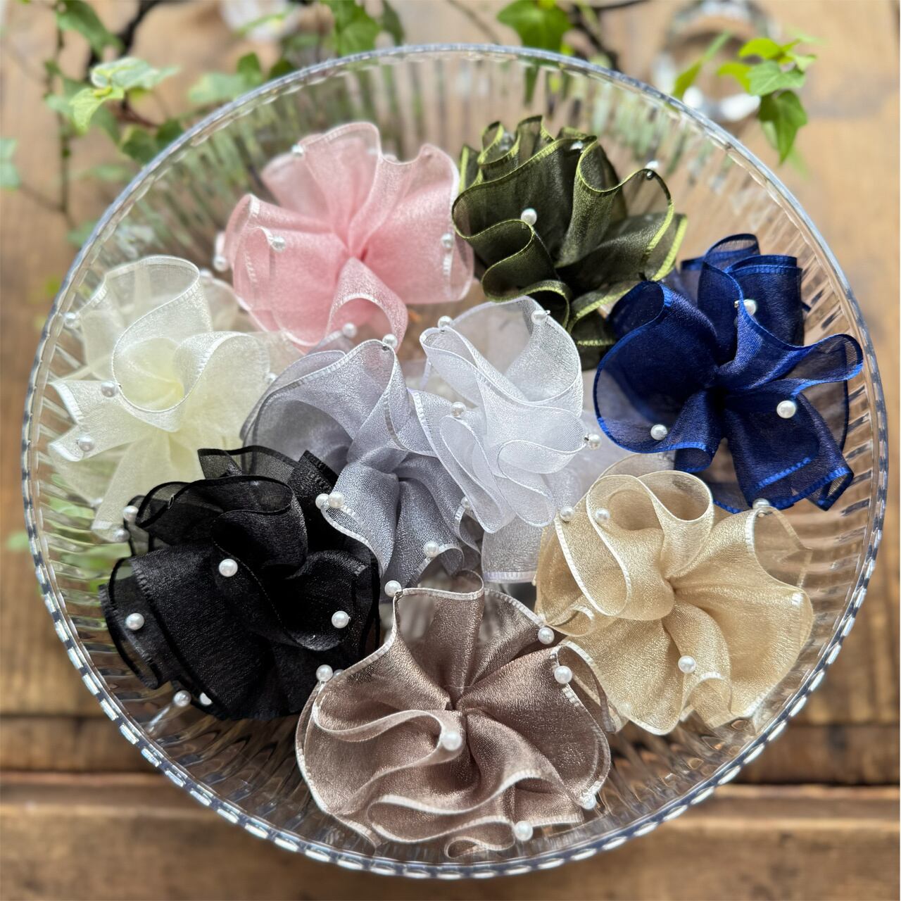 ・オーガンジー特有の透け感・光沢の出方、パールの位置は一つひとつ異なります。
