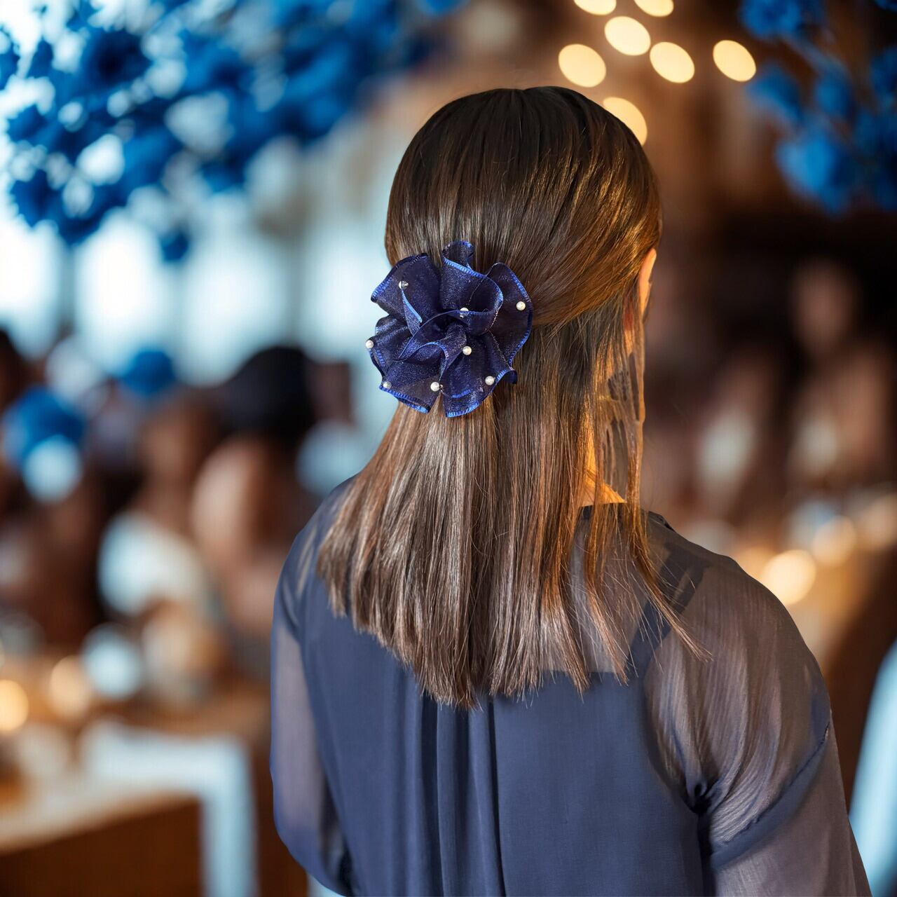 【ポニーフック】ふんわりパフィ Midnight Lake(ネイビー)— ぽんぽんオーガンジーの上品リボン